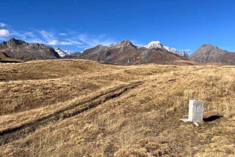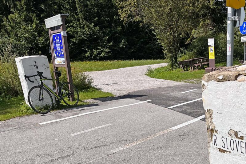 | Jussi Laine. The walking path from Séez at the France-Italy border, 2022 | Jussi Laine. Bicycle parked at Tarvisio/Trbiz in the Italy-Slovenia borderlands, 2023 |