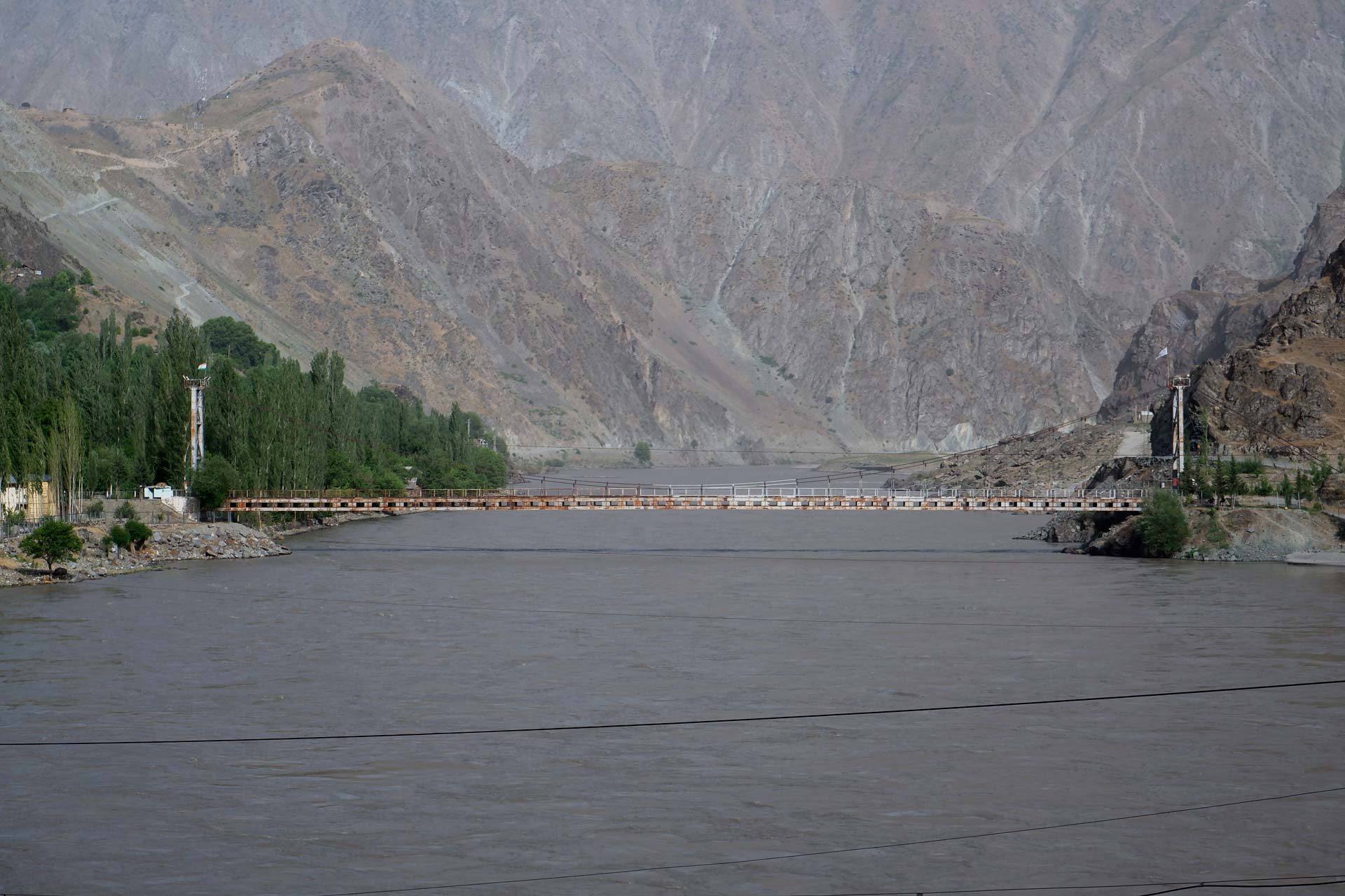 Often, natural bodies such as mountains and rivers provide a convenient landmark for designating political borders. For instance, the Pyanj River marks the border between Tajikistan (on the left bank) and Afghanistan (on the right bank). The photos, which Mélanie Sadozaï took in the district of Ishkashim and the village of Ruzvai (both from the Tajikistan side), show the river and bridge both connecting and separating the two contemporary states.