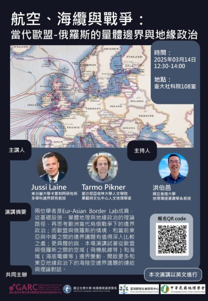 On March 14, members of the Eur-Asian Border Lab participated in an insightful workshop at the Global Asia Research Center, National Taiwan University, focusing on the intersection of geopolitics, borders, and technological advancements. The event, hosted by Yikung Po-Hi, featured two of our own researchers, Jussi P. Laine and Tarmo Tikker, who shared their expertise on contemporary EU-Russia relations and border studies.