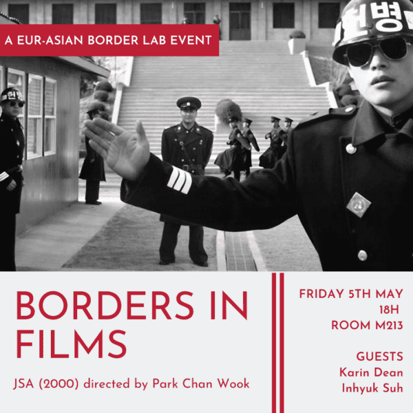 The Eur-Asian Border Lab team is happy to invite you to a screening of Joint Security Area (2000) ; a film by renowned Korean director Park Chan Wook about the unlikely friendship of Korean soldiers stationed on opposite sides of the North/South Korean border.